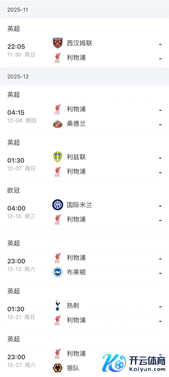 利物浦以前赛程密集,英超将对阵西汉姆、桑德兰、利兹联,欧冠下一轮的敌手是国米。