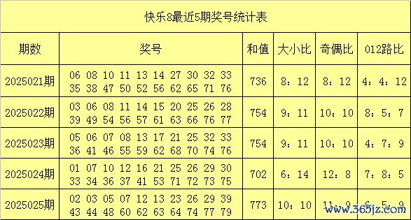 舒心8第2025025期奖号为:02 03 05 07 12 13 23 26 29 39 43 44 48 60 62 63 64 74 77 79,其中奖号012路比为6:5:9,跨度为77。
