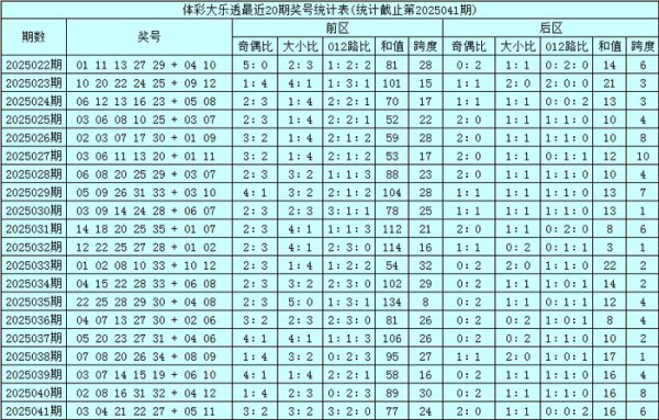开奖总结:体彩大乐透第25041期开出奖号:0304212227+0511,前区号码和值为77,大小比为3:2,跨度为24体育集锦,奇偶比为3:2。后区为冷码+冷码。 大乐透第25032期-第25041期前区奖号冷温热散布统计: 前区冷码判断:大乐透第2025041期开奖之后前区包含7个遗漏值9以上的冷码,各冷码遗漏期数诀别为:号码1835遗漏值为10期、号...