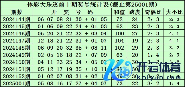 体彩大乐透第25001期奖号为:05 08 16 17 27 + 04 07。前区奖号和值为73,跨度为22,奇偶比为3:2,大小比为1:4。后区奖号和值为11,跨度为3。