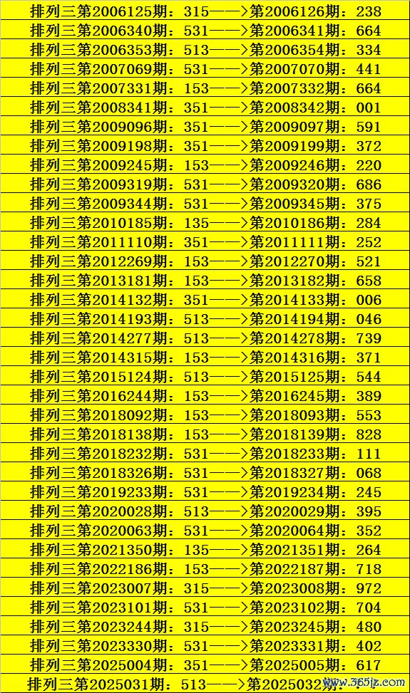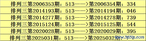第2025031期陈设三奖号为513,历史上该号码直选出现6次,下期奖号折柳为:334、046、739、544、395。